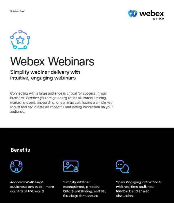 Check out this solution brief to learn how you can revamp your approach to virtual events with Cisco’s Webex Webinars. If you’re looking to manage and deliver engaging, high-quality webinars, you’ll find that Webex Webinars can help you effortlessly reshape your digital meetings and corporate events. With this robust, intuitive tool, you can not only create lasting impressions but also expand your audience reach and curate secure experiences. Learn about its integrated video and audio, high-definition broadcasting to mobile devices, and ability to accommodate large audiences no matter where they’re located. Explore how you can effectively manage, measure, and plan your virtual events beginning with automated email invitations, webinar series arrangement to post-event recording sharing and engagement insights. Ensure top-notch security and control using Single Sign-On (SSO) options and customizable attendee registration. Change the way you engage with your audience through live polling, real-time translations to 100+ languages and in-event chat possibilities. Contact us to learn more and get started today.