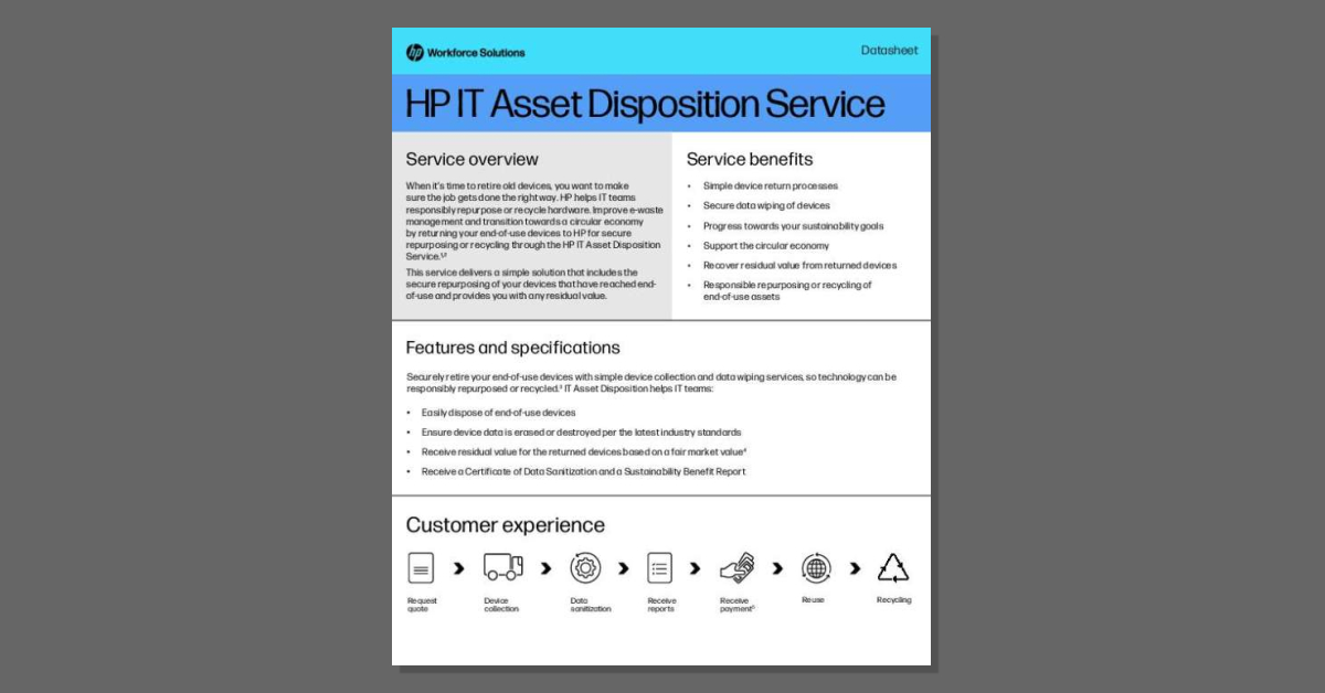 IT teams face real risks when devices reach end-of-use: data exposure, compliance challenges, and e-waste. The datasheet, “HP IT Asset Disposition Service,” shows how HP addresses these risks with secure collection, certified data wiping, and responsible repurposing or recycling. Organizations also benefit from fair-market residual value and sustainability reporting. Download the datasheet to see how HP makes IT asset management safe and sustainable, and contact Tener Technologies, LLC to discuss how this service can strengthen your IT lifecycle strategy.