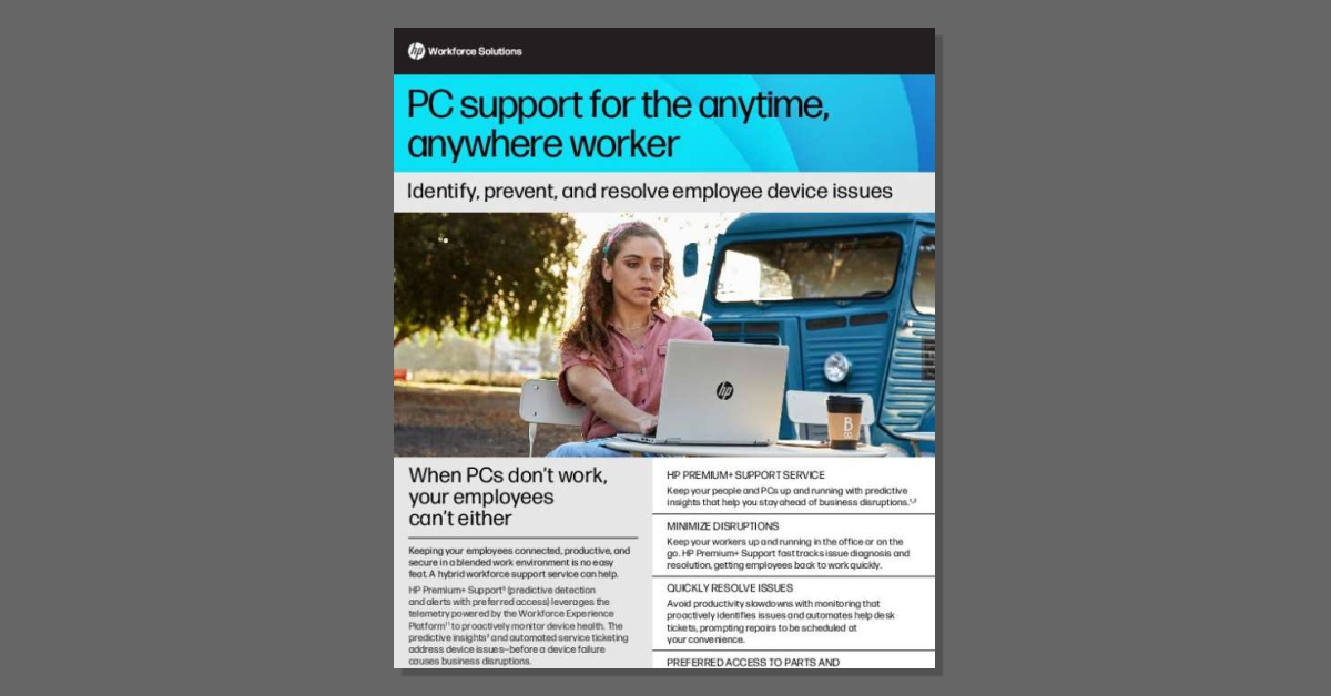 Today’s hybrid employees can’t afford downtime. The solution brief, “PC Support for the Anytime, Anywhere Worker,” shows how HP Premium + Support delivers fast, predictive, and flexible service to prevent disruptions and resolve issues from anywhere. Download the solution brief to see how HP keeps your teams connected and contact Tener Technologies, LLC to discuss Premium + Support options tailored to your business.